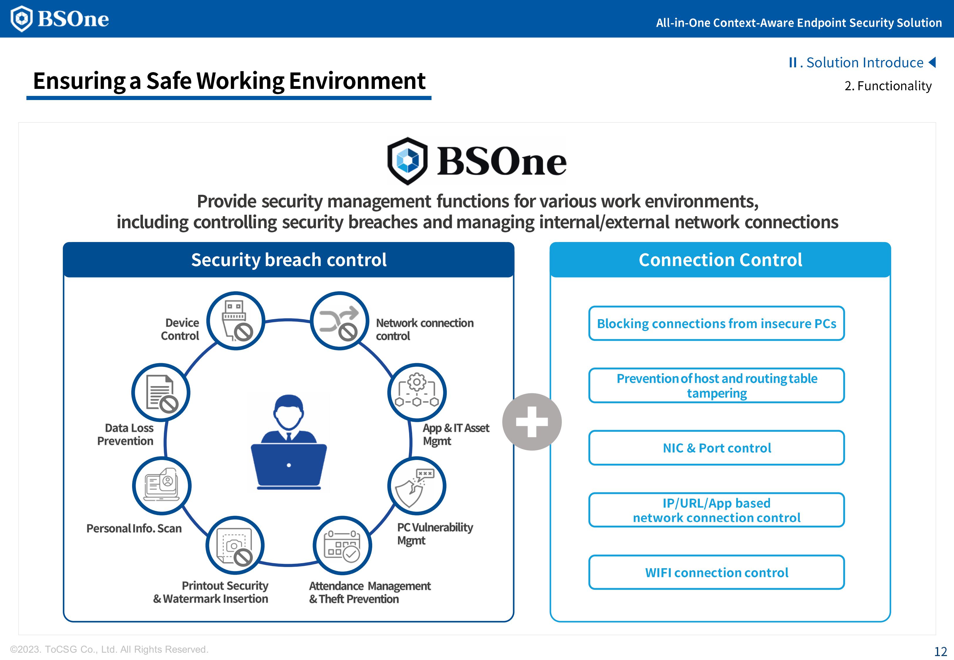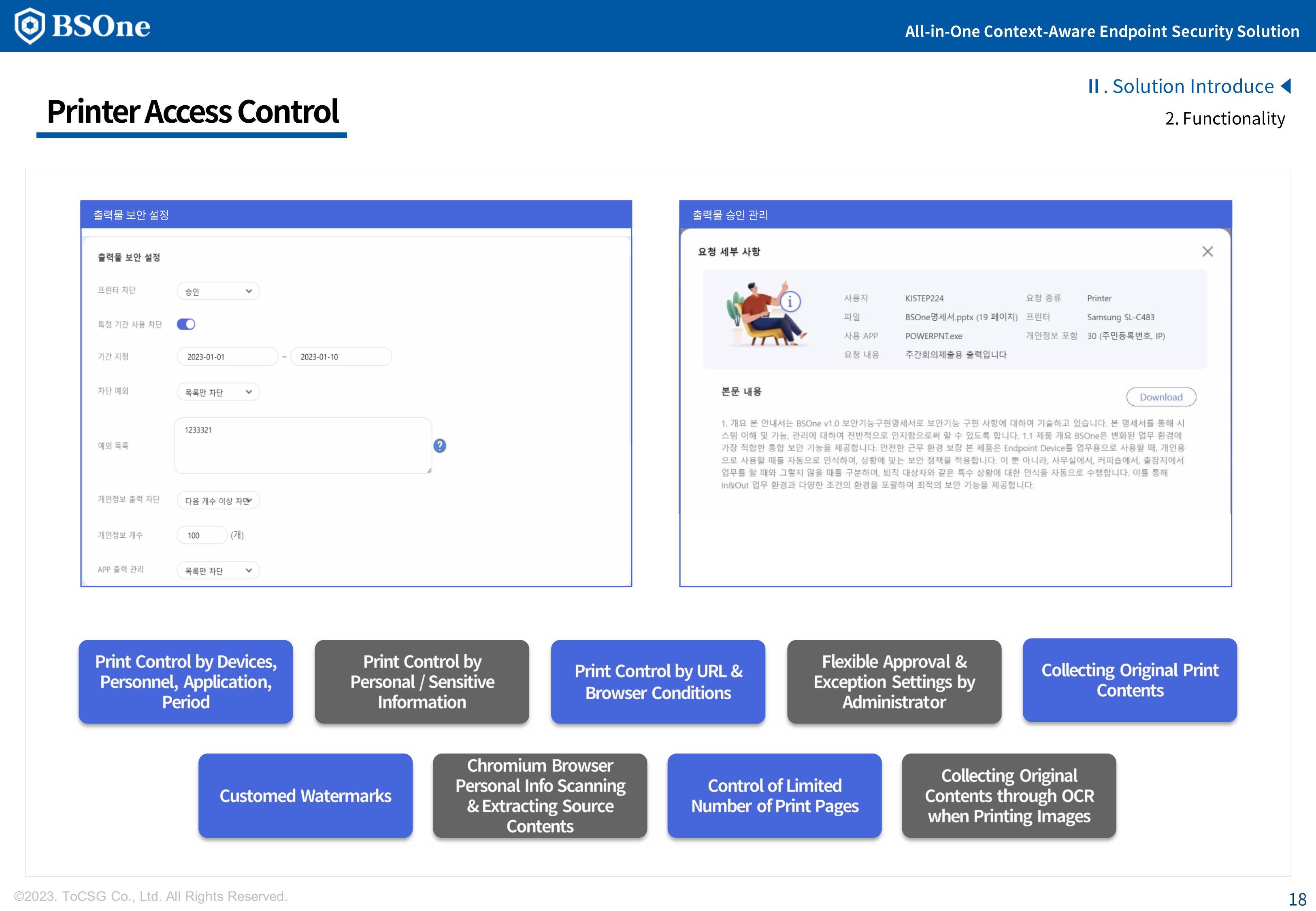 BSOne is an integrated PC security solution that provides various security features such as DLP, media control, and DRM with a single agent.