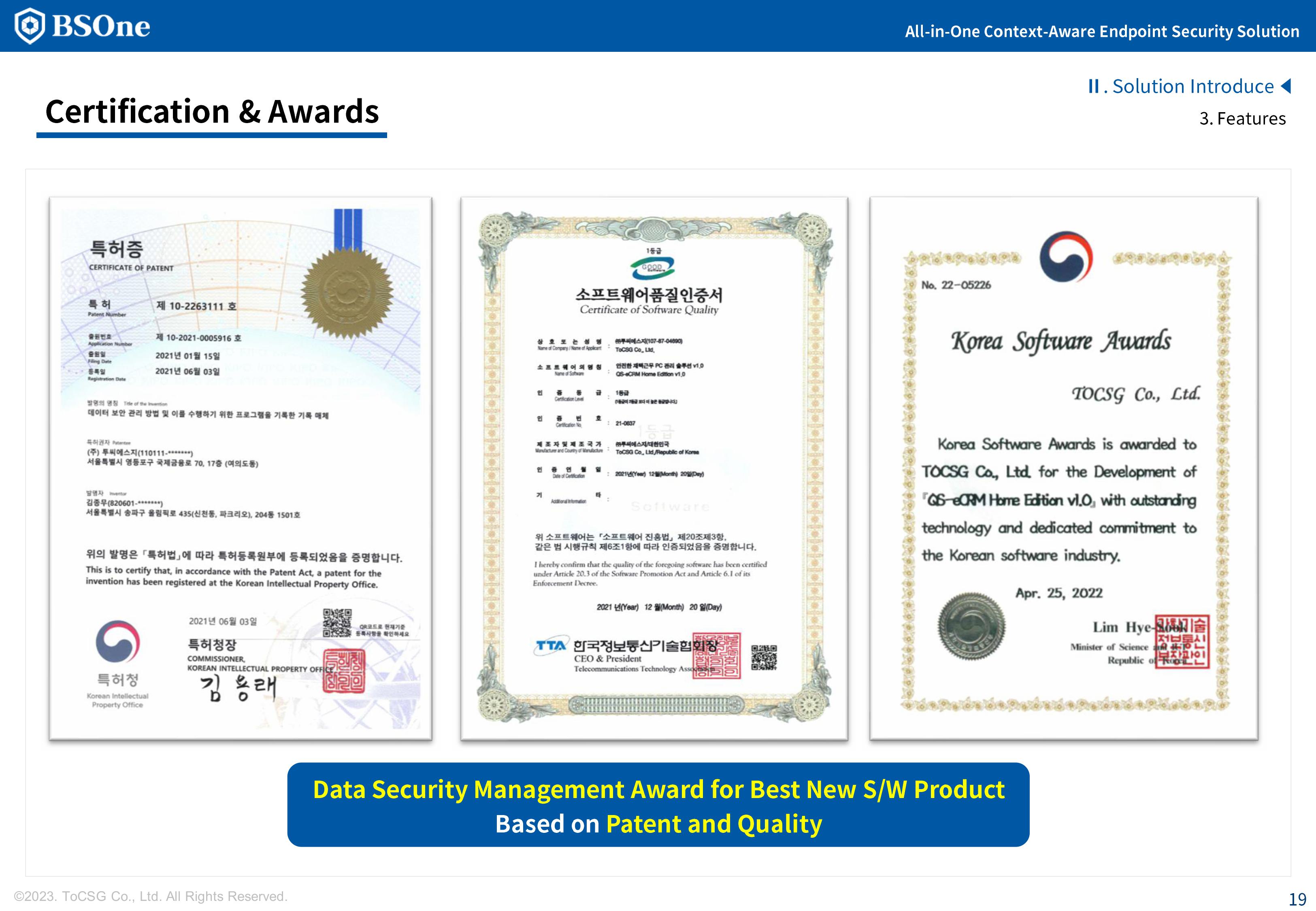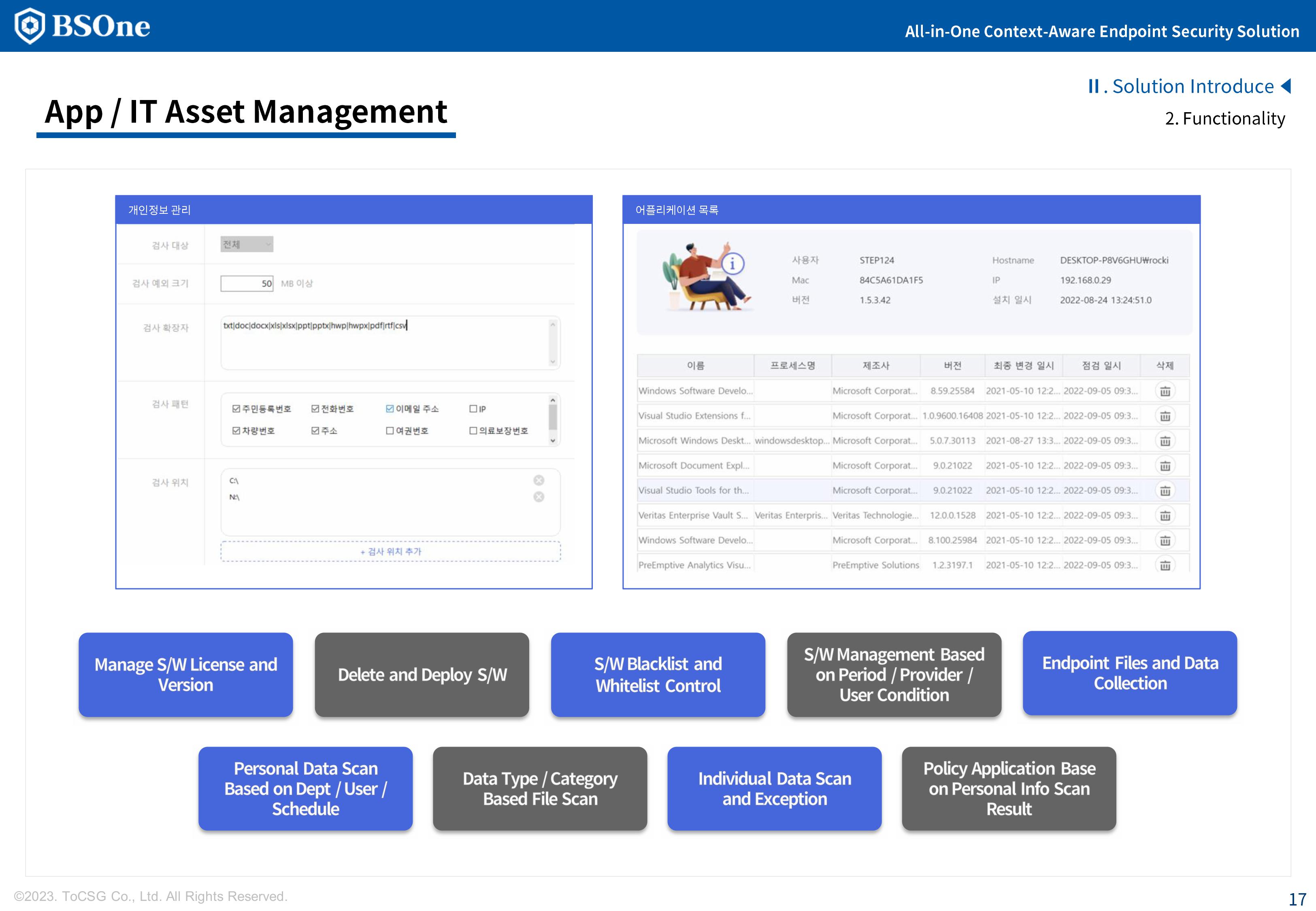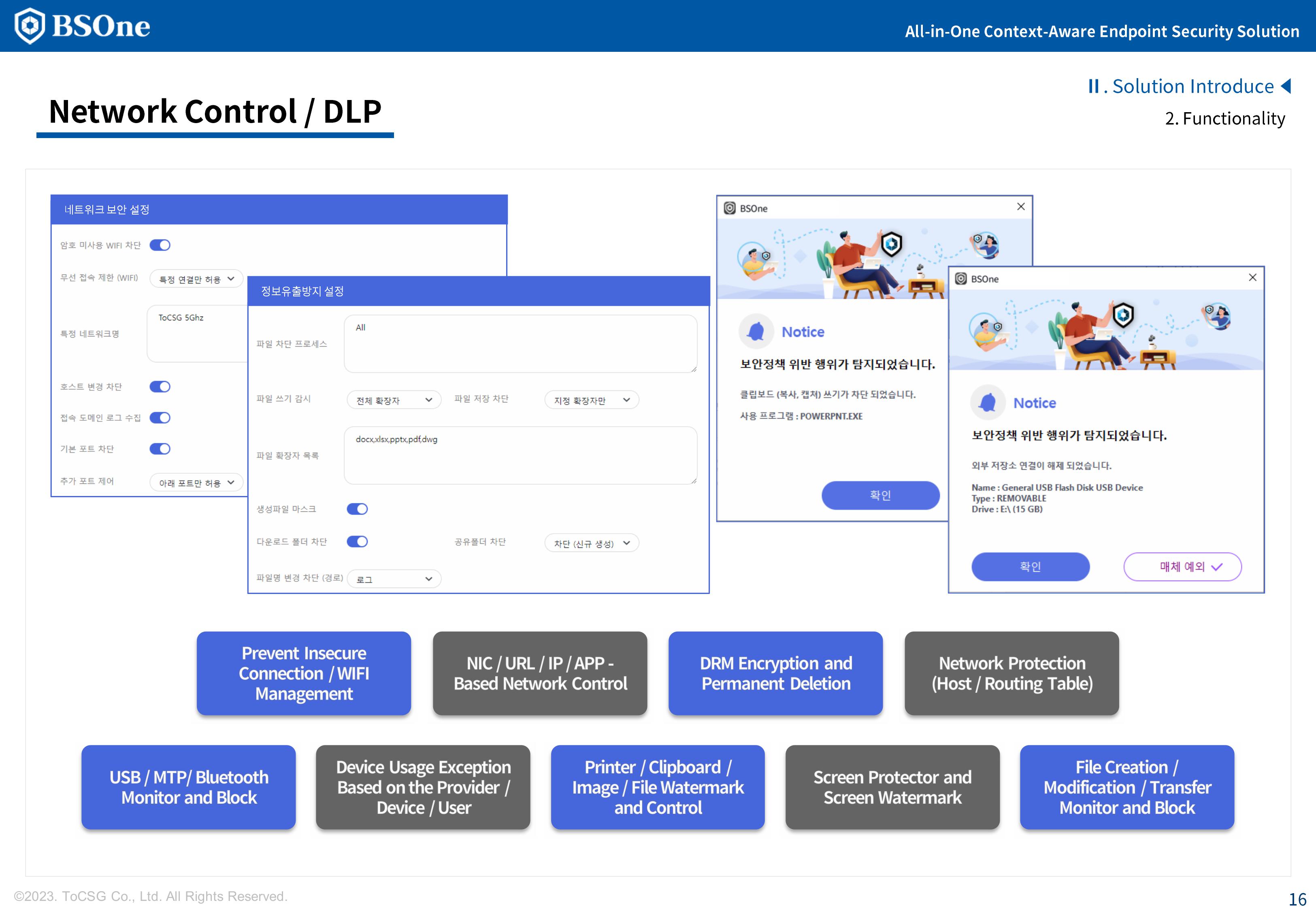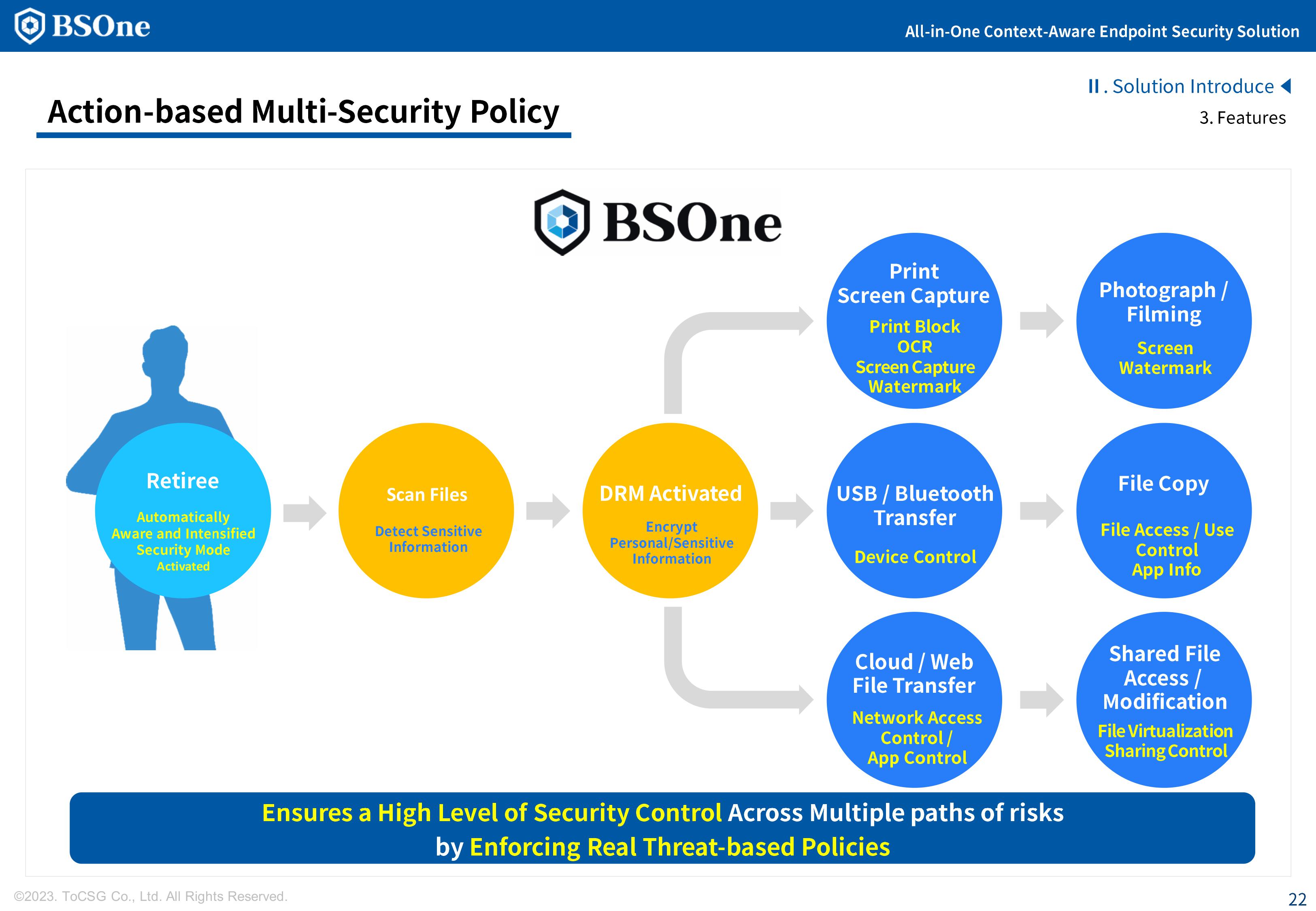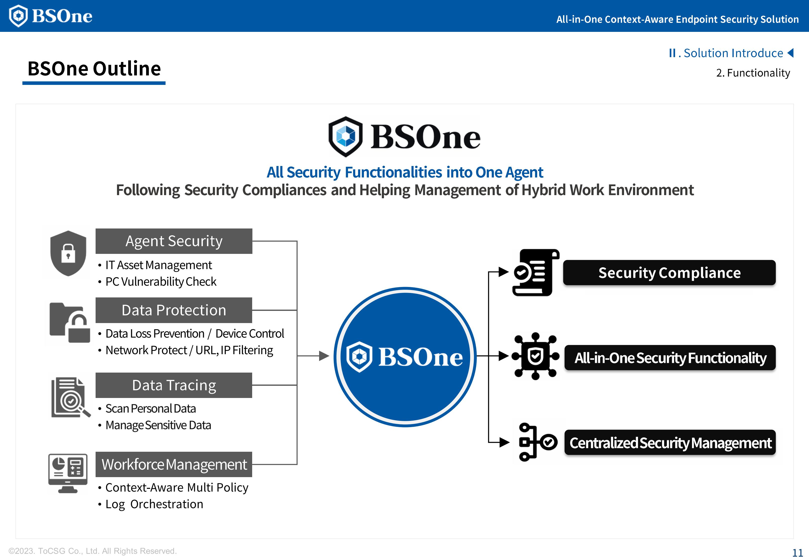 BSOne is an integrated PC security solution that provides various security features such as DLP, media control, and DRM with a single agent.